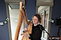 [1 VIDÉO, 4 PHOTOS]. Superbe entrée parmi les spectateurs au bar de Domitys. Découverte pour certains du son particulier de la harpe celtique…