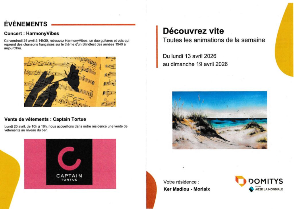 [1 CALENDRIER]. Lun, scrabble. Mar, prix Domitys. Mer, gym. Jeu, express. corpo. Ven, apéro nouveaux résidents, concert berlivet. Sam, concert ZaïZaï. Dim, film…